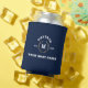 Custom modern navy blue vintage boat can cooler with cool nautical lettering reading CAPTAIN, your monogram in a printed golden laurel, and your personalized boat name. Great gift for a boating trip, your own sailboat, yacht, or boat crew.