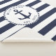Stylish nautical navy blue and white blanket with a template to personalize with your boat name, year or another text. The design features anchor inside a rope circle on a striped background.