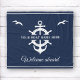 Nautical boating fleece blanket reading your custom boat name surrounded by a ship's well and anchor on modern navy blue with seagulls as well as a second line of text ready to be personalized.