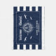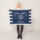 Welcome aboard! Nautical boating fleece blanket reading your custom boat name surrounded by a compass with an anchor on modern navy blue stripes with seagulls as well as a second line of text ready to be personalized.
