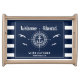 Welcome aboard! Nautical boating serving tray reading your custom boat name surrounded by a compass with an anchor on modern NAVY BLUE stripes with seagulls as well as a second line of text ready to be personalized.