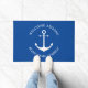 Custom Boat name or Family name, Welcome Aboard, nautical white anchor. white letters blue Doormat.
