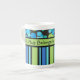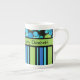 A chic Bone China Coffee Mug to personalize, with a quirky 'Blue Moons' pattern in bright blues and neon green on a black background, teamed with a coordinating deckchair-striped pattern. Part of the Posh & Painterly 'Blue Moons' collection; from a handpainted paper collage design by Judy Adamson.