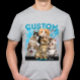 Get ready to rock a one-of-a-kind t-shirt featuring your very own furballs! This design channels that iconic 90s bootleg style, with a cool lightning background and space for your "CUSTOM Name" and "CUSTOM Photo." It's the perfect way to show off your beloved cats in a totally unique and edgy way.