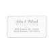 Your address personalized in a easy way... in a white label with two lines of text aligned by center, and with bride and groom names and family name written in stylish gray font styles