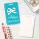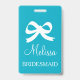 Custom bridesmaid name badges for wedding party. Aqua blue with little bow tie and elegant font. Great for bachelorette party, bridal shower and beautiful weddings. Classy design. Make your own for maid of honor, matron of honor, flower girl, mother of the bride etc. Also handy for other guests.