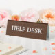 A brown leather-like desk name sign, offering a classic and sophisticated way to display a name in an office setting.