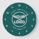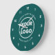 Replace the sample company logo and text with your own in the sidebar to create a stylish minimal wall clock for your business with a simple teal background. Your text curves around the top and bottom of your logo. White or light colored logos will work best with this design. If you want the background color to show through your logo, upload a version of your logo with a transparent background. Bold white numbers around the edge make it easy to tell the time. Click to customize further if you need to adjust the size of your logo with the scale buttons or to change the blue-green background color.