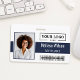 Give your company a polished, modern look with this horizontal badge design. The layout is defined by a clean, geometric aesthetic, using a white and navy blue block structure to expertly organize an employee's photo, name, and title. A designated space for a logo completes the design, creating a sophisticated and professional accessory for any workplace or event.