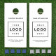 Custom branded cornhole bean bag toss yard game set features a business logo design centered on the front and framed by custom text that can be personalized with the name of the company, location, slogan, website, or other info. White background and black text colors can be modified.