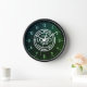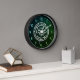 The size of the clock is dramatic and the abstract alcohol ink design is soothing and intricate at the same time. I chose the black frame that adds pop to the blue and gold design. The gold printing would be better in a slightly darker or larger font. I love it and I’m looking for just the right place in ny new apartment. I would recommend this clock for a personal gift or a present. I feel that the quality is excellent for the money! I’m a bit of a clock nut so I’m pretty particular about my purchases. The clock is larger in diameter than many if the clocks I have, so it stands out very well. I think a slightly darker printing color and a moderately larger size would best suit a professional decor or add more impact in a work place item.