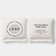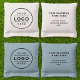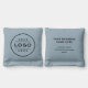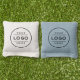 Double-sided custom cornhole bags featuring your business logo on the front and your company name, address, and contact details on the back in a clean light colorway. A polished branded set for company events, trade shows, and corporate outings. Replace the placeholder images with your logo and business information. The white and dusty blue / gray bag colors can be modified to match your brand.