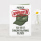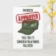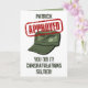 Custom passing out parade greeting card featuring a white background, a red stamp which reads 'APPROVED', a camo army cap, the soldiers name, and a congratulations template that is easy to personalize. the text font styles, sizes and colors can be ammended by clicking on the customize further link after personalizing.
