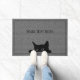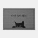 Add your family name, your cat's name, and / or other message to this fun faux gray burlap custom door mat featuring a partially hidden black cat and black border - a great gift for a cat lover! Shown is the large mat. From Heard_.