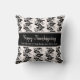 Vibrant blush pink and black leaves Happy Thanksgiving throw pillow, with customizable text on a thick black strap. The design shows black leaves in a tiled pattern, against a blush pink background. The design is repeated on the reverse. Text currently reads HAPPY THANKSGIVING and GIVE THANKS TO THE LORD FOR HE IS GOOD. All text is CUSTOMIZABLE, so you can add your name or create your own text. Choose from a wide selection of Thanksgiving home decor gifts designed by Berean Designs. Available in other colors.