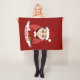 Throw blanket with an illustration of a cute smiling happy girl with short black hair, she is wearing red and white Santa Claus costume and holding a present; with editable text template for your name or message, Christmas holidays design with a red background