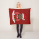 Throw blanket with an illustration of a cute smiling happy black girl with short hair, she is wearing red and white Santa Claus costume and holding a present; with editable text template for your name or message, Christmas holidays design with a red background