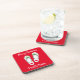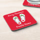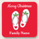 Custom Christmas in July beverage coaster. Add your own surname and greeting. Funny beach flip flops design with stylish script typography. Red or custom color. Cork backing. Holiday decor ideas.