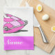 A custom towel with white script letters on pink and Cinderella's glass slipper on a pillow in light and dark princess pink, antique art restored from a vintage drawing for a storybook.