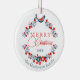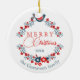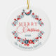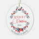This charming December Christmas holiday tree ornament showcases a stylish design showcasing a beautiful classic Scandinavian Christmas floral wreath with a peace dove and a traditional Christmas greeting. Additionally, it offers space for customization or personalization for your own text and family name. It is an elegant seasonal greeting that friends and family members will undoubtedly cherish.
