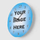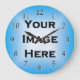 To customize this product, upload your own background image or photo as shown above. To resize or adjust its position, click the Customize It! button below the product image. The positions of the numbers on the clock face can also be tweaked to your liking by resizing the transparent clockface image. You can also add your own text and/or other images if you wish to further personalize this design.