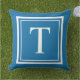Stylish outdoor accent pillow features a serif monogram letter that you can personalize with your first or last name initial, framed by a simple double square frame in white color with cobalt blue background color. You may customize the background color to coordinate with your home decor.