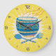 Colorful Mexican food kitchen clock with an Aztec style decorative food bowl, fork and spoon in blue with rough design and starburst background.