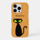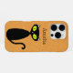 Mod kitty with green eyes and an orange background. If you have a different case, you may have to customize, so the camera doesn't cover your name. You can change the background colour. Personalize it or remove the name!