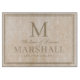 Elegant cream and tan damask pattern cutting board with the couples first names, last name monogram, full last name, and wedding date available in customizable templates.