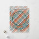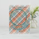 Unique, classic, cute and decorative Holiday season greeting card. With fun Happy Thanksgiving wish on a cozy warm colorful teal blue and orange red colored plaid tartan pattern. With room to customize or personalize with your own cheerful photo and family name on the front of the card, and a customizable season greeting poem on the backside of the card with option for family member names.