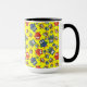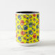 A white Ringer Mug with a black lip and handle and a pattern of cute owls in red, blue, green on a yellow background, which you can easily change by using the edit button. The owl pattern was an original handpainted paper collage design by Judy Adamson.