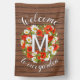 Fun garden or house flag with contemporary yellow white daisies and red poppies wreath on a weathered looking farmhouse style wooden planks pattern. With room to customize or personalize with (limited) text of your choice.
