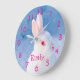 Animal print. Face and head close-up of a cute rabbit with red eyes and white fur. Blue backdrop color (the rabbit is out in snow) Customize and add the girls name, pink colored letters and clock numbers.