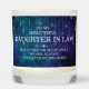 Personalized Daugther in Law scented candle with a long-distance heartfelt message for Christmas. Design in blue and white with a mystical style featuring glitter-like blinking or flickering stars and a quote reading.