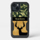 This case features your personal name on camo background with a large antler buck silhouette on faux gold foil background.
