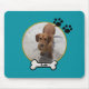 This fun mousepad features a teal background with two paw prints and a bone surrounding a cut out in the center. You can input a photo of your favorite pet into the circular cut out in the center!