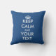 Custom Keep calm and your text throw pillow. Navy blue and white color. Cute home decor for bedroom or sofa. Make your own funny keep calm and carry on parody design. Customizable vintage typography template with crown. Cosy decoration print with personalizable background color. Create your own humorous version by editing this trendy double sided template. Keepcalm spoof examples: Keep calm and party on. Keep calm and love me. Keep calm and get married.