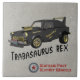 A computer-generated, black and gold, image of a customized East German Trabant automobile. The customized car's nickname, Trabasaurus rex, in an appropriate font, appears both on the vehicle door and below the image. The vehicle bears an Idaho license plate reading "TRABI REX" as it was customized by mythical Warsaw Pact Wonder Wheels (Classic Commie Cars) in Sandpoint. The Warsaw Pact Wonder Wheels logo also appears. The Trabant was the people's car of East Germany "Trabant" means travelling companion and was inspired by the Russian word "sputnik" with the same meaning. Over 3 million Trabants were produced in the span of 30 years. The Trabant's engine was underpowered, inefficient and created much pollution. The much maligned Trabant, or Trabi as it was commonly known, has long been the butt of jokes, but has become trendy in recent years. Some have been imported to the United States. The roof, trunk lid,hood,fenders, and doors were constructed with Duroplast, a hard plastic akin to Bakelite, made of recycled materials: cotton waste from the Soviet Union and phenol resins from the East German dye industry. This made the Trabant the first car with a body made of recycled material and was partially responsible for the misconception that it was made of cardboard. Various crash test results showed it performed better than comparable contemporary Western hatchbacks.