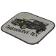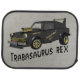 A computer-generated, black and gold, image of a customized East German Trabant automobile. The customized car's nickname, Trabasaurus rex, in an appropriate font, appears both on the vehicle door and below the image. The vehicle bears an Idaho license plate reading "TRABI REX" as it was customized by mythical Warsaw Pact Wonder Wheels (Classic Commie Cars) in Sandpoint. The Trabant was the people's car of East Germany "Trabant" means travelling companion and was inspired by the Russian word "sputnik" with the same meaning. Over 3 million Trabants were produced in the span of 30 years. The Trabant's engine was underpowered, inefficient and created much pollution. The much maligned Trabant, or Trabi as it was commonly known, has long been the butt of jokes, but has become trendy in recent years. Some have been imported to the United States. The roof, trunk lid,hood,fenders, and doors were constructed with Duroplast, a hard plastic akin to Bakelite, made of recycled materials: cotton waste from the Soviet Union and phenol resins from the East German dye industry. This made the Trabant the first car with a body made of recycled material and was partially responsible for the misconception that it was made of cardboard. Various crash test results showed it performed better than comparable contemporary Western hatchbacks.