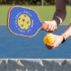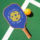 This Custom Eat Sleep Repeat Pickleball Paddle features a blue background with a yellow pickleball in the center of the keychain with the saying "eat sleep repeat pickleball wrapped around the ball. Personalize it with your name or initials in a script font. A great gift for a coach or pickleball enthusiast.