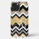 Contemporary white, black, and faux shiny gold glitter chevron zig zag stripes pattern. With room to customize or personalize with a monogram or initial of your choice. Beautiful, modern, and cool cover for the trend-savvy and art-loving hip trendsetter, artsy motif lover who wants to protect their phone from dust and dirt, wear and tear. This design is available in Apple iPhone 6, 7, 8, 10 or X, XR, XS, 11, 12, 13 Mini, 14, 15 Plus, and Pro Max cellphone cases. Show off your style, look fashionable trendy, and feel stylish with a unique design on a mobile device accessory of your choice.
