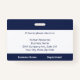 Horizontal custom photo ID badges feature your employee's photo, name, professional job abbreviation and job title, ID number, business logo and name. You can also include a department if you like. Perfect for any profession. On the back you can add more information, such as where to return the badge if it gets lost. Customize it with a photo, any shape logo, and custom text in the sidebar. The square photo on the left has a thin white border surrounded by navy blue stripes across the top and bottom and thin navy lines by its sides. A white block on the center right side highlights the logo, job title, ID number, and expiration date in dark blue text. The staff person's name, job initials, and hospital or business text is white on dark blue.