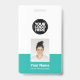 Easily personalize this Custom Employee Name Badge with Photo, Scan Bar Code and large business logo. A simple business design in turquoise light blue and white colors fully customizable in front and back sizes, sans-serif basic and modern fonts and a professional and clear look. Avaiable with lanyard, metal clip or with retractable. No minimum order.
