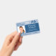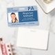 Keep your hospital or medical practice safe with horizontal custom photo ID badges featuring your employee's photo, name, professional job abbreviation, job title, ID number, and business name. You can also include a department if you like. Perfect for a physician assistant, nurse, or other staff. On the back you can add more information, such as where to return the badge if it gets lost. Customize it with a photo and custom text in the sidebar. The square photo on the left has a thin dark blue border surrounded by light blue stripes across the top and bottom and thin pale blue lines by its sides. A dark blue block on the center right side highlights the job title, ID number, and expiration date in white text. The staff person's name, job acronym, and hospital or business text is navy on light blue.