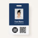 Easily personalize this Custom Employee Name Badge with Photo, Scan QrCode and Bar Code and business logo. A simple business design in navy blue and white colors fully customizable in front and back sizes, sans-serif basic and modern fonts and a professional and clear look. Avaiable with lanyard, metal clip or with retractable. No minimum order.
