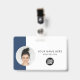 Easily personalize this Custom Horizontal Business Minimalist Employee Name Badge with Photo, Scan Qr Code or Scan Bar Code and business logo. A simple business design with round photo, in navy blue and white colors fully customizable in front and back sizes, sans-serif basic and modern fonts and a professional and clear look. Avaiable with lanyard, metal clip or with retractable. No minimum order.