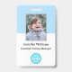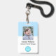 Create your own custom, personalized, durable PVC plastic, won't fade or tear, cool modern trendy light blue and white, name photo ID badge, with choice of attachments - lanyard, metal clip, retractable, or none. To personalize, enter the name of the employee / staff / executive, their designation, and any additional information like employee ID, issue & expiry date of the badge, if lost return to & the address, etc. Next add the photo of the employee / staff / executive, add the business / company logo, and add the barcode. While you type/design, you'll be able to see a preview of your badge, throughout. Great for small business, corporate, school, restaurant, office, concert, retail, hospital, clinic, and for employee, staff, doctor, teacher, student.