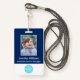 Create your own custom, personalized, durable PVC plastic, won't fade or tear, cool modern trendy navy blue and white, name photo ID badge, with choice of attachments - lanyard, metal clip, retractable, or none. To personalize, enter the name of the employee / staff / executive, their designation, and any additional information like employee ID, issue & expiry date of the badge, if lost return to & the address, etc. Next add the photo of the employee / staff / executive, add the business / company logo, and add the barcode. While you type/design, you'll be able to see a preview of your badge, throughout. Great for small business, corporate, school, restaurant, office, concert, retail, hospital, clinic, and for employee, staff, doctor, teacher, student.