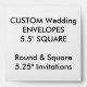 Custom Square Envelopes, 5.5" square envelope for 5.25" square & round invitations. LINEN: elegant paper with a beautiful textural surface of embossed laid lines. 115lb text weight. Formal, evoking mold-made letterpress papers.