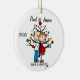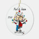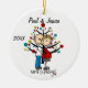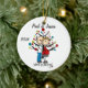 A pretty round ceramic keepsake Christmas holiday ornament features a stick figure couple expecting a baby standing in front of a decorated Christmas tree, and text that reads "We're Expecting!". You can personalize this cute stick figure ornament by adding your names and current year!